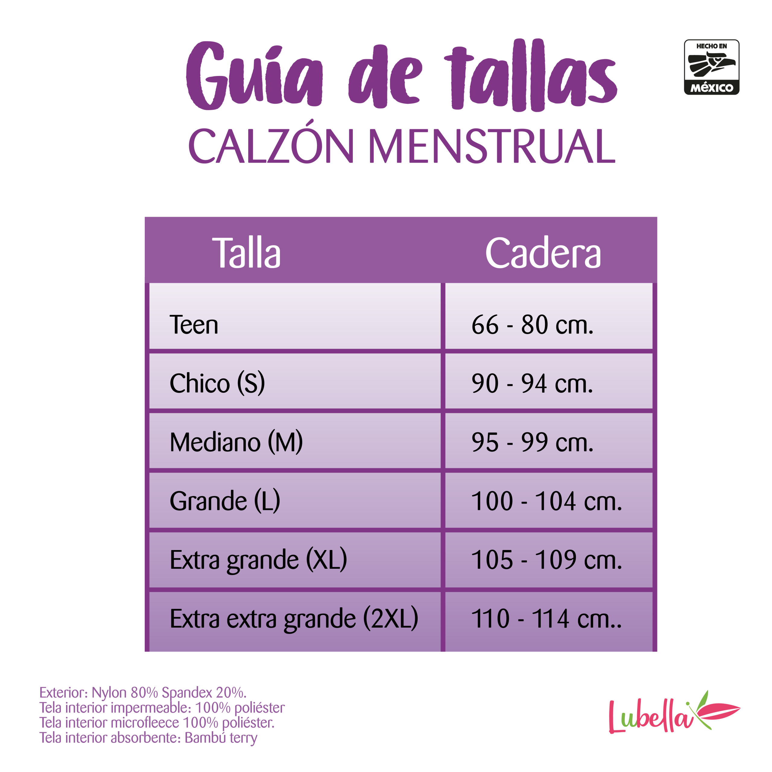 Pensando en la seguridad y comodidad de todas las mujeres, creamos un calzón menstrual con la absorción suficiente gracias al bambú de su interior que permitirá usarlo hasta por 8 horas, aunque sabemos que por higiene, se debe cambiar cada 4 horas. Su interior en tono claro, permite conocer el tono de la sangre para llevar una gestión menstrual más cuidada y también ayuda a saber en qué momento cambiarlo e impedir fugas. Además es antibacterial y transpirable para evitar sarpullidos y sudoraciones, no guarda olores, es reutilizable, lo puedes lavar en lavadora con detergente biodegradable e incluso detergente para toallas femeninas. Su capacidad es equivalente a 6 tampones o 60 ml. ¿Cuántos necesitarás? Los que consideres suficientes para dos o tres días, lavarlos y volverlos a usar, tienen un periodo de vida de al menos 7 años, los calzones menstruales Lubella están hechos en México y además cuentan con garantía (consulta términos de la misma).